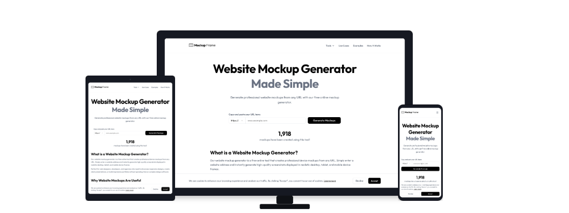 Our website mockup generator is a free online tool that creates professional device mockups from any URL. Simply enter a website address and instantly generate high-quality screenshots displayed in realistic desktop, tablet, and mobile device frames.